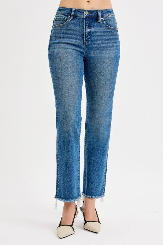 These Risen brand tummy control jeans are a customer favorite for good reason—they smooth and support through the midsection while still feeling comfortable all day. The high-rise waist offers a flattering, held-in feel and the straight-leg shape creates a clean, elongating line from hip to hem. Finished with a raw edge hem, they feel current without being trendy. We love them paired with a simple tee and sneakers for everyday wear, a lightweight sweater and booties for casual days, or a polished blouse and heels for an elevated look. Fit is true to size with stretch that moves with you while gently shaping through the tummy and hips without feeling tight.
