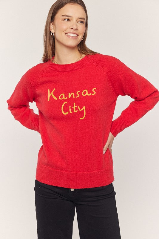 This Kansas City sweater is the perfect blend of warmth and spirit, ideal for game days or casual weekends. The vibrant red and embroidered gold lettering make it stand out, while the ribbed trim keeps the fit classic and comfortable. Style it with black jeans and boots for a chic, put-together look, or keep it casual with denim and sneakers. Add hoop earrings or a crossbody bag to elevate this cozy fan-favorite piece.