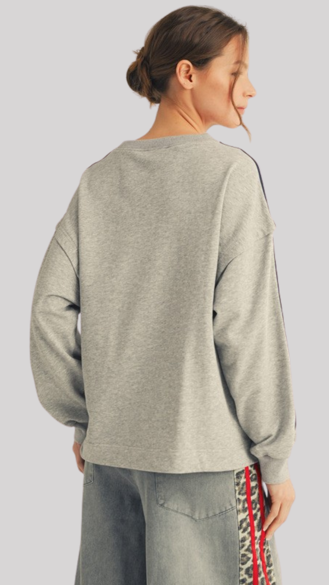 This grey pullover is a versatile staple with a sporty twist, featuring bold navy and white stripes running down the sleeves for an athletic-inspired edge. Its relaxed fit and soft fabric make it an easy go-to for lounging, errands, or casual outings. Pair it with joggers and sneakers for an athleisure vibe, or style it with straight-leg jeans and white trainers for a clean, everyday look that feels effortlessly cool.