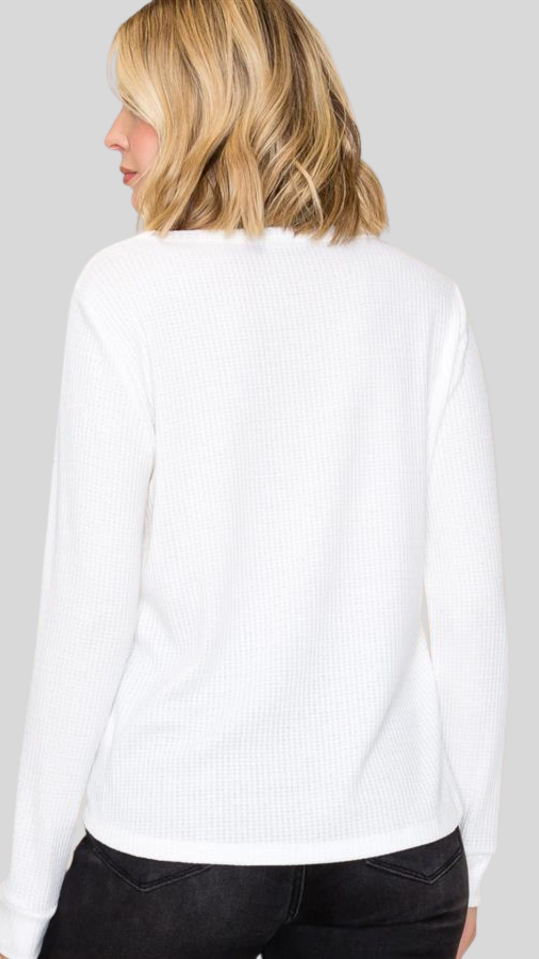 This white waffle knit top is a timeless layering piece that blends comfort with casual style. Its lightweight, breathable fabric makes it perfect for year-round wear, while the textured waffle knit adds subtle detail. Pair it with jeans and sneakers for a laid-back weekend look, or layer it under a jacket or cardigan for added warmth and dimension. Dress it up slightly by tucking into tailored trousers and adding loafers, or keep it cozy with leggings for lounging. A versatile closet staple you’ll reach for again and again.