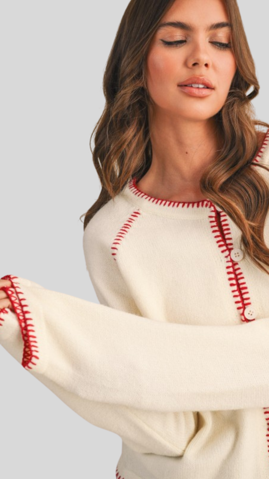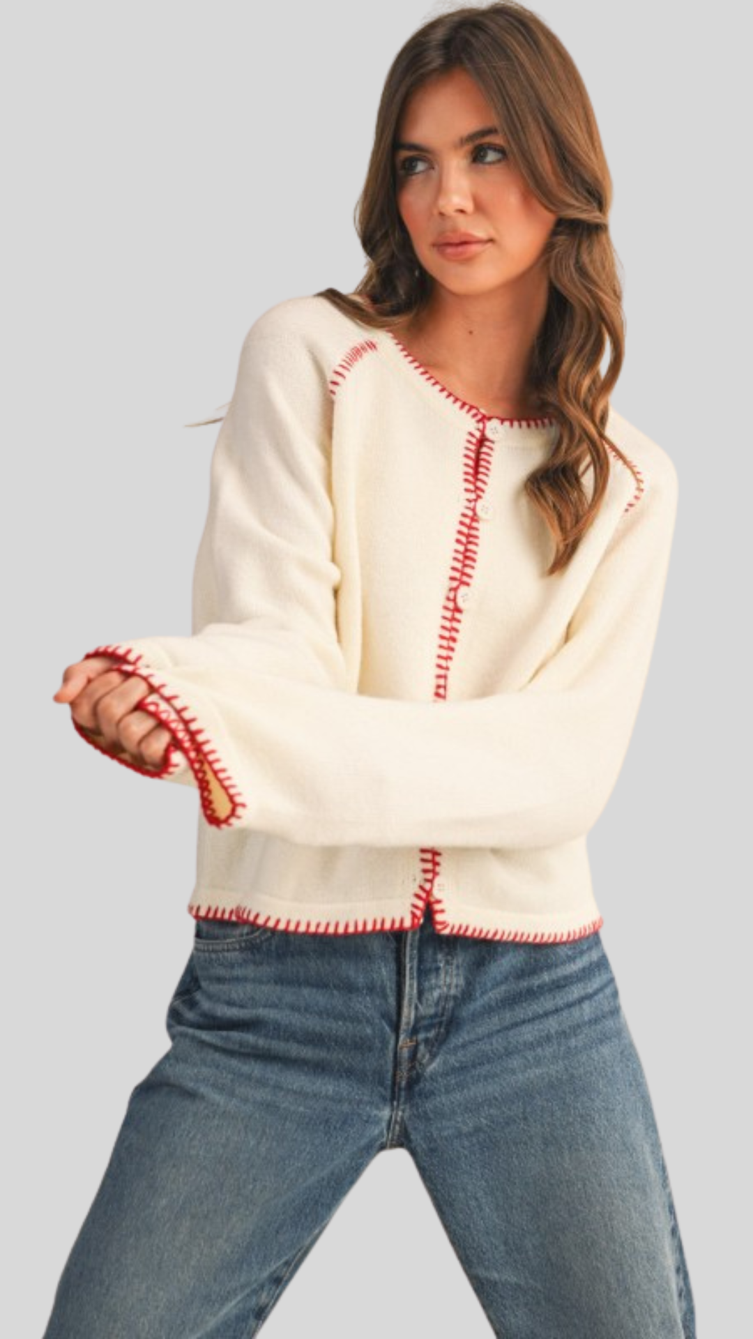 This ivory sweater with bold red whipstitch trim is a playful update to a classic cardigan. Its contrast detailing and slightly cropped length give it a modern, eye-catching vibe while keeping it versatile for everyday wear. Style it with high-waisted denim and sneakers for a laid-back weekend look, or layer it over a simple slip dress with ankle boots for a chic transitional outfit. Add gold hoops or layered necklaces to complete the effortlessly stylish ensemble.
