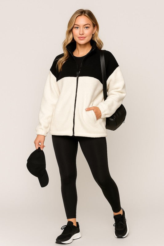 Meet your new cold-weather go-to. This ultra-soft sherpa jacket delivers that plush, wrapped-in-a-blanket feel while keeping your look effortlessly elevated. A bold black-and-ivory colorblock gives it a modern edge, and the relaxed fit makes it easy to layer over tees, knits, and everything in between.