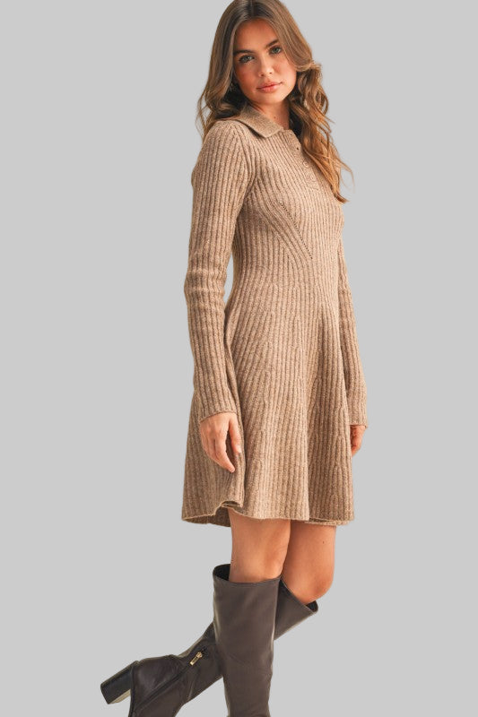 This ribbed knit sweater dress is the definition of cozy-chic. The collared neckline and button-front detail give it a polished, preppy feel, while the soft ribbed fabric and flattering fit-and-flare silhouette keep it comfortable and feminine. Style it with tall boots for a classic fall look, or add tights and a belt for a more dressed-up vibe. It’s the perfect one-and-done outfit for coffee dates, brunch, or any crisp autumn day.