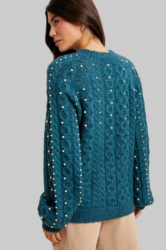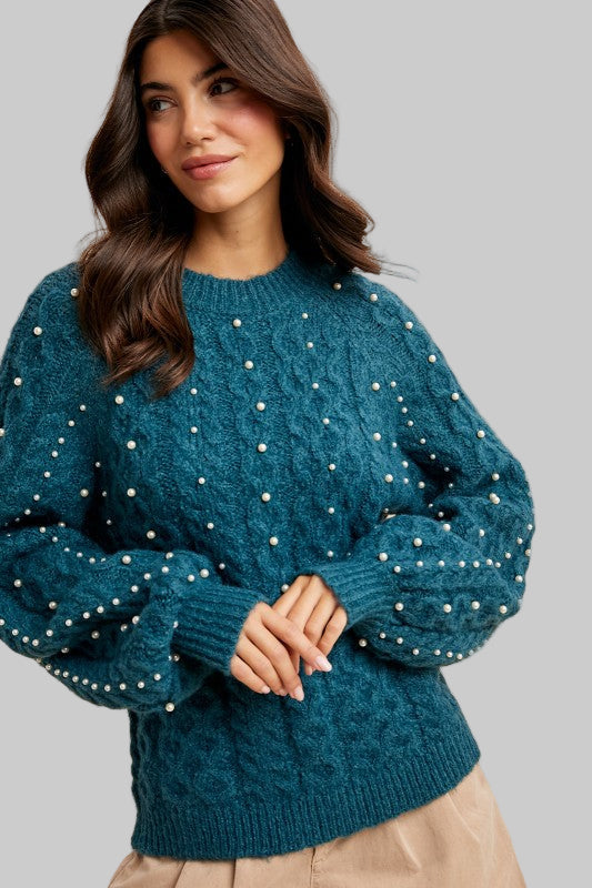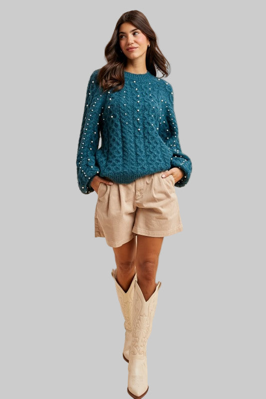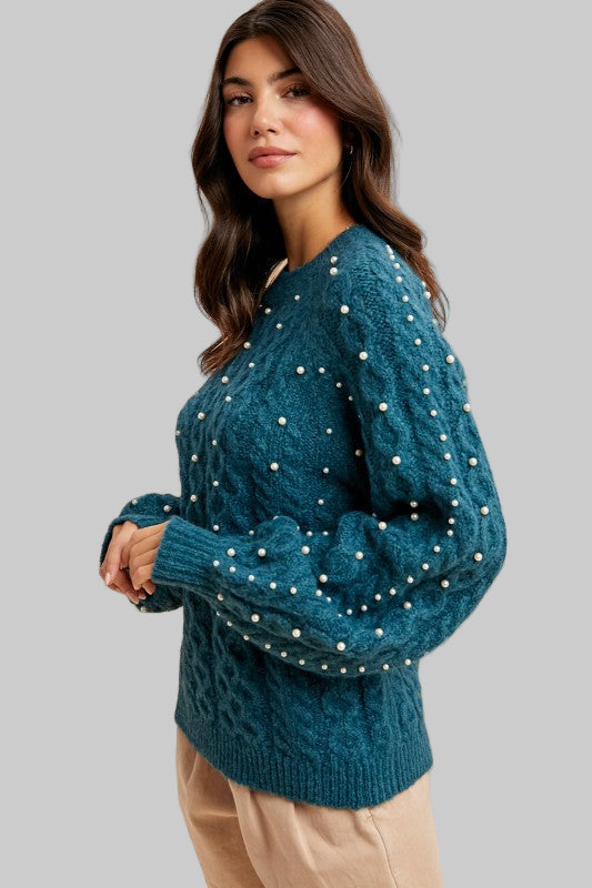 Cozy meets classy in the prettiest way. This chic teal sweater is sprinkled with delicate pearls across the sleeves and bodice, giving you that effortless “dressed up without even trying” vibe. The soft, textured knit keeps things warm and comfy, while the balloon sleeves add the perfect touch of feminine drama. Pair it with denim, skirts, or tailored pants—she’s a holiday-season stunner and an everyday favorite.