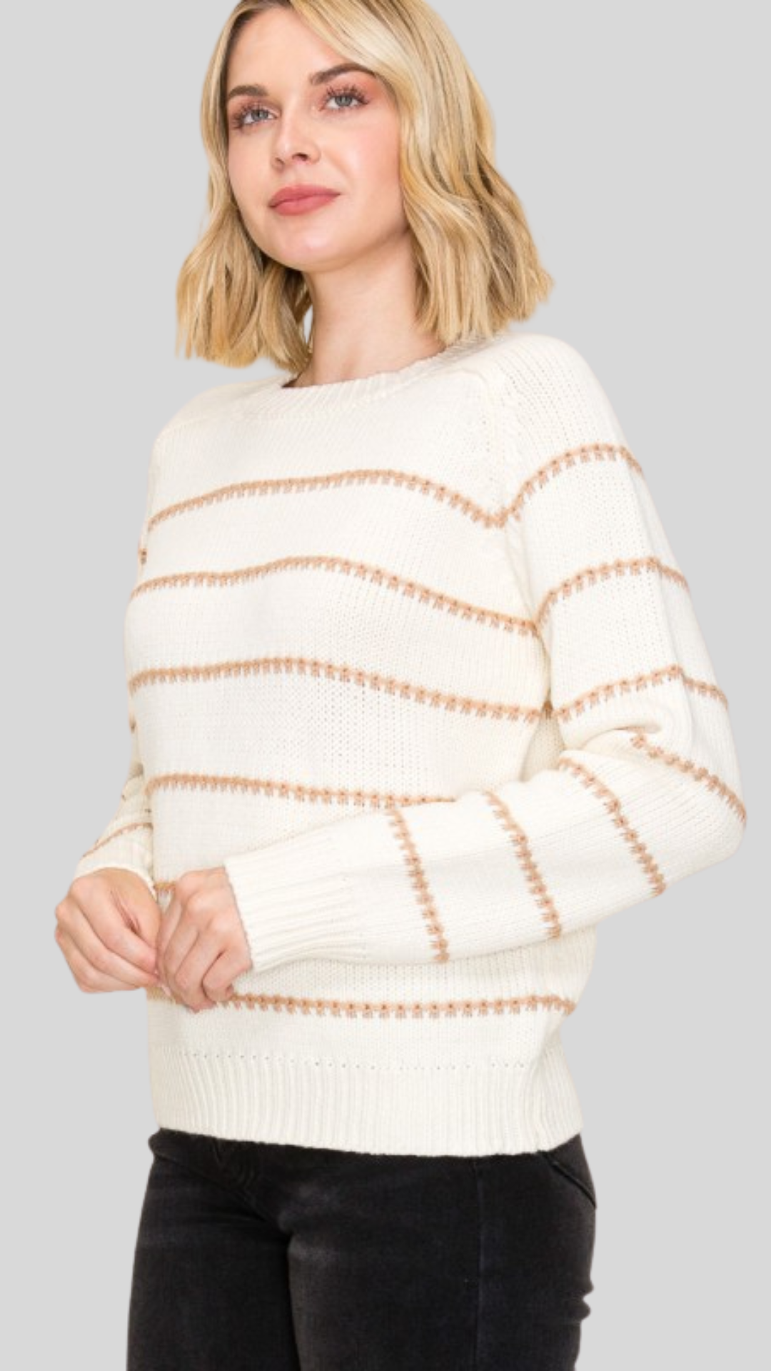 This ivory striped sweater is a classic staple with a touch of modern charm thanks to its camel-toned stripes. Its relaxed silhouette makes it perfect for everyday wear, offering comfort while still looking put together. Style it casually with your favorite jeans and ankle boots for a laid-back weekend look, or tuck it into a midi skirt with sneakers for a chic yet effortless vibe. Add a denim or leather jacket on cooler days for an easy layered outfit.
