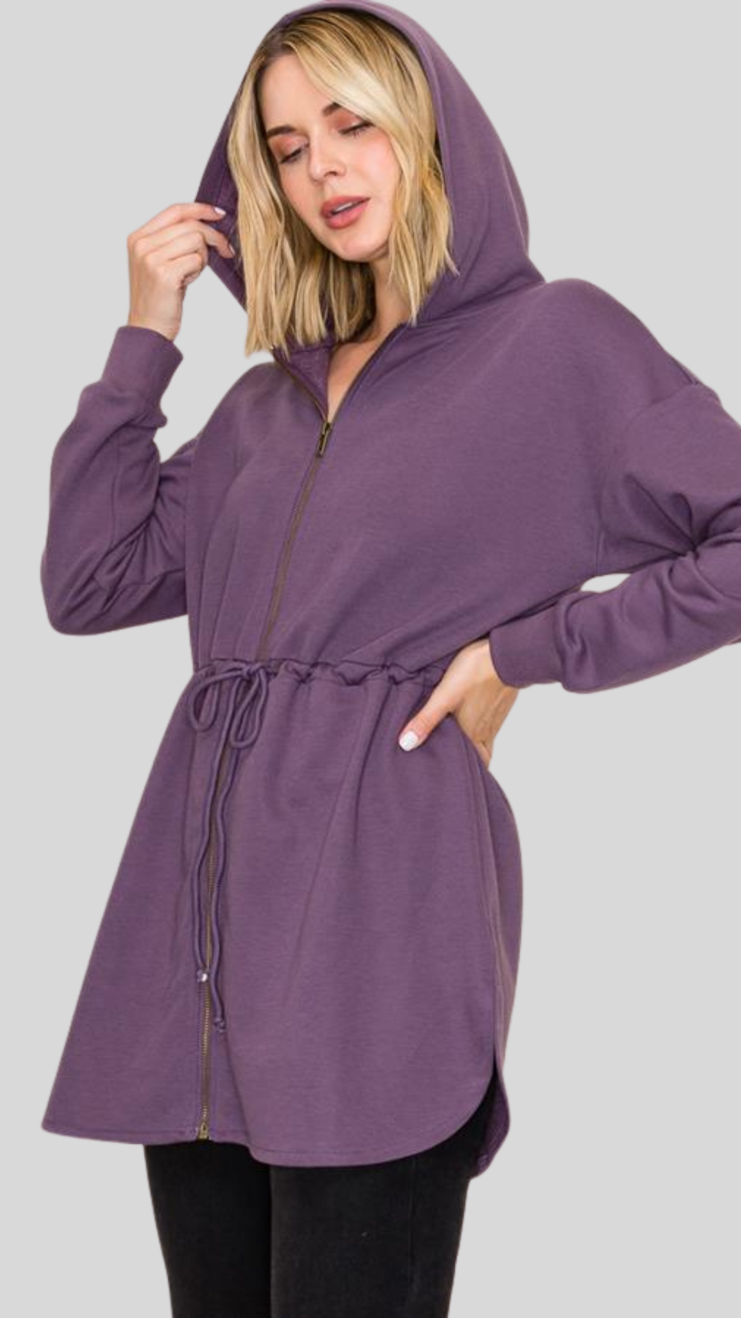 This is a purple colored zip-up hoodie tunic with a relaxed, longline silhouette and drawstring waist for adjustable shape and comfort. It features a full front zipper, curved hemline, and side pockets, blending cozy loungewear vibes with an elevated, feminine touch.