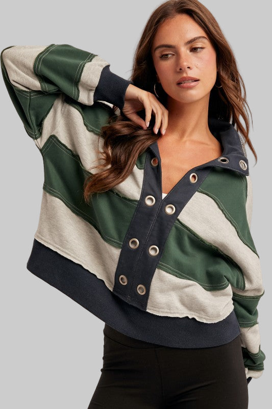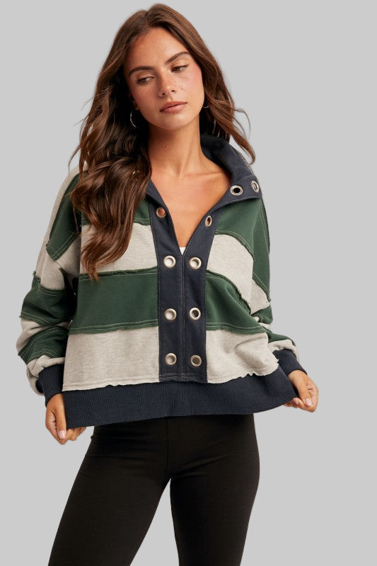 This pullover is a total standout — sporty, edgy, and effortlessly cool. The wide rugby stripes, oversized grommet placket, and raw-edge seams give it that perfectly lived-in vibe while the relaxed silhouette keeps it comfy and casual. Wear it with black leggings and sneakers for everyday errands, pair it with denim and a boot for a weekend look, or style it off one shoulder for a slouchy, relaxed fit. Great for tailgates, travel days, or anytime you want a cozy top with a little personality.