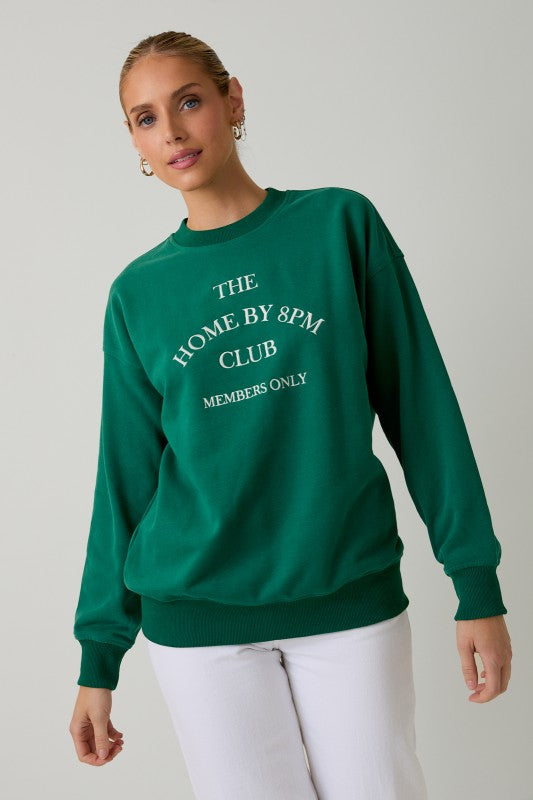 - Green colored sweatshirt w white “ Home by 8 PM club members only”